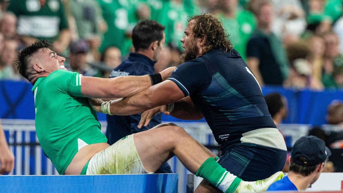 FAIR PLAY?: Ireland's Dan Sheehan is pushed backwards over an advertising hoarding by Scotland's Pierre Schoeman as tempers flared in Saturday's encounter at the Stade de France.Â