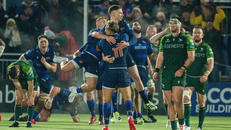 OVER AND OUT: Ben Healy of Edinburgh celebrates with team-mates after scoring a drop goal to win the United Rugby Championship match between Edinburgh and Connacht at The Dam Health Stadium in Edinburgh, Scotland. Pic: Paul Devlin/Sportsfile