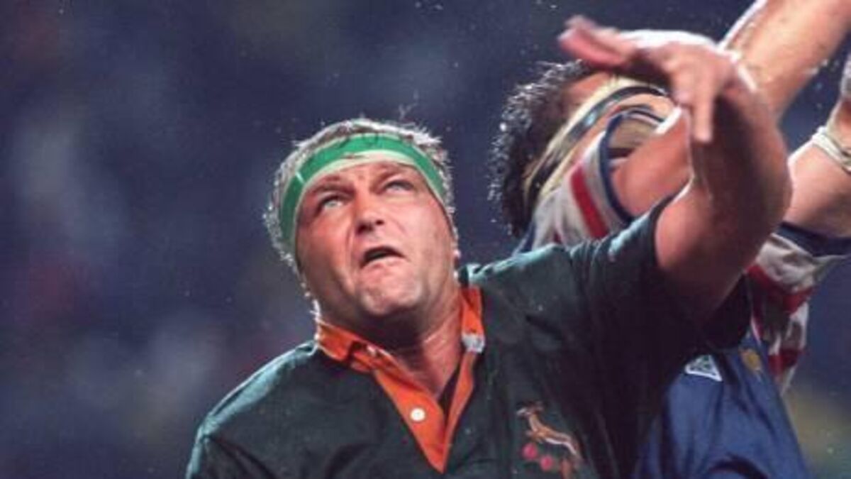 Hannes Strydom of South Africa competes in the line out in the 1995 World Cup against France.