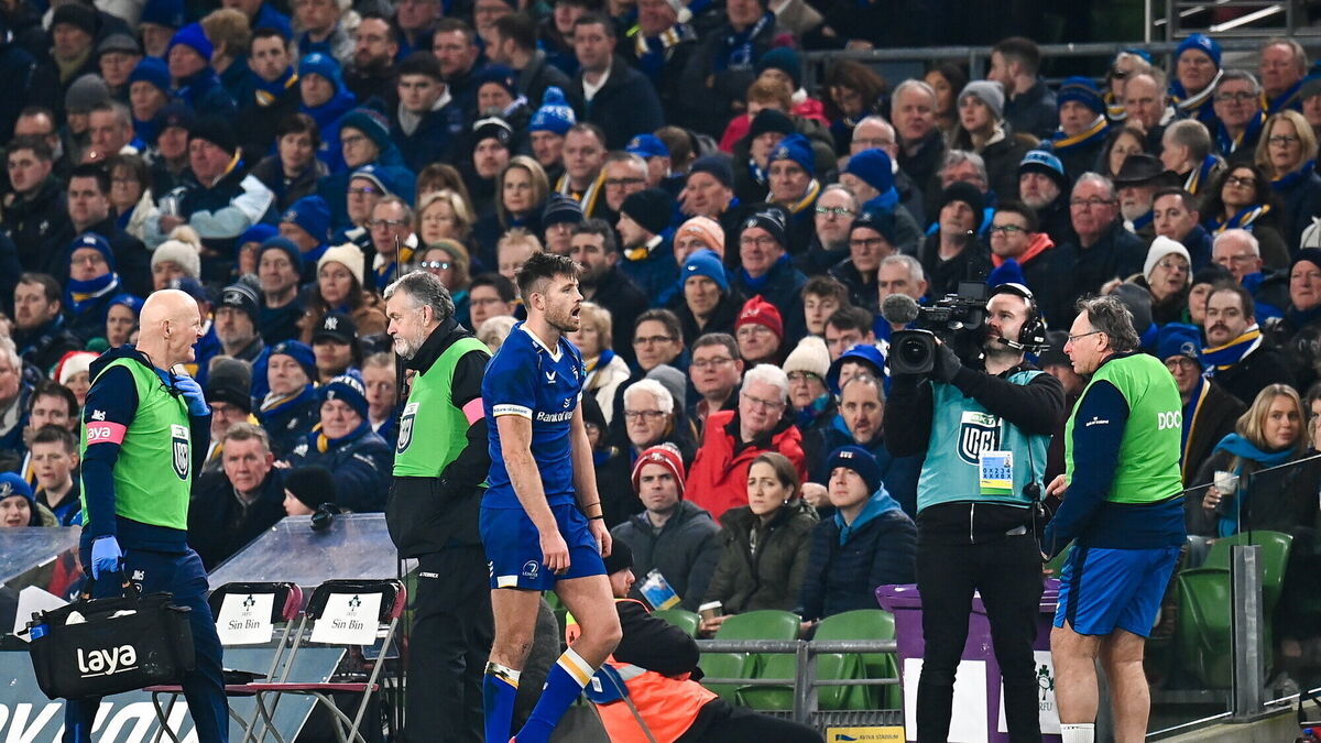 NEXT MAN UP: Ross Byrne of Leinster leaves the field with an injury during the United Rugby Championship match between Leinster and Munster at the Aviva Stadium in Dublin. Pic: Harry Murphy/Sportsfile