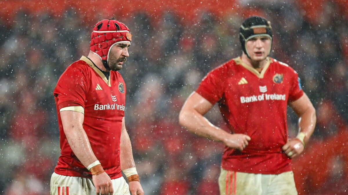 REMAINING UPBEAT: John Hodnett and Gavin Coombes of Munster during the United Rugby Championship match between Munster and Leinster at Thomond Park. Photo by Brendan Moran/Sportsfile