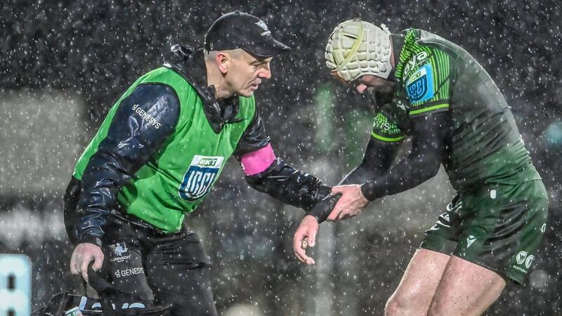 RULED OUT OF SIX NATIONS: Mack Hansen of Connacht leaves the pitch to receive medical attention for an injury during the United Rugby Championship match between Connacht and Munster at The Sportsground in Galway. Pic: Piaras Ó Mídheach/Sportsfile
