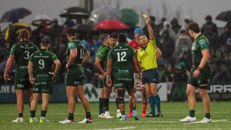 THREE MATCH BAN: Referee Chris Busby shows a yellow card to Connacht's Byron Ralston after a clear out that resulted in an injury to Jack O'Donoghue. Pic: ©INPHO/James Crombie