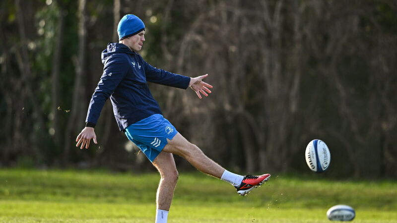 KICKING ON: Sam Prendergast during a Leinster Rugby squad training session at UCD on Monday. Picture: Harry Murphy/Sportsfile