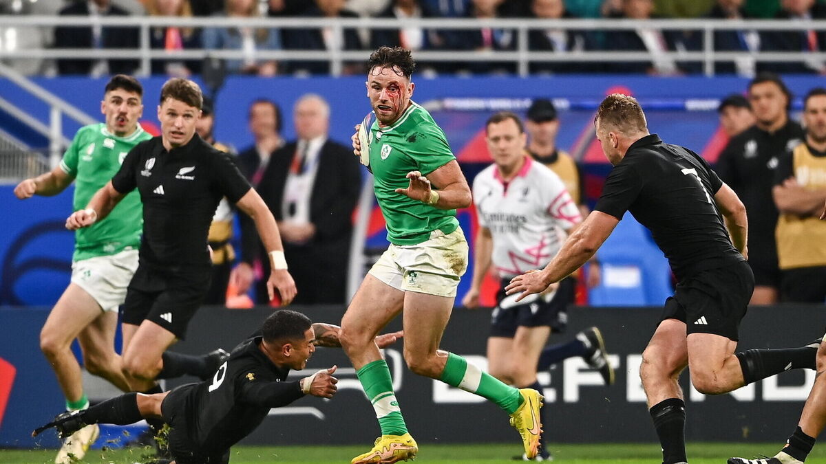 Hugo Keenan of Ireland evades the tackle of Aaron Smith and Sam Cane of New Zealand during the 2023 Rugby World Cup quarter-final match between Ireland and New Zealand at the Stade de France in Paris, France. Pic: Harry Murphy, Sportsfile