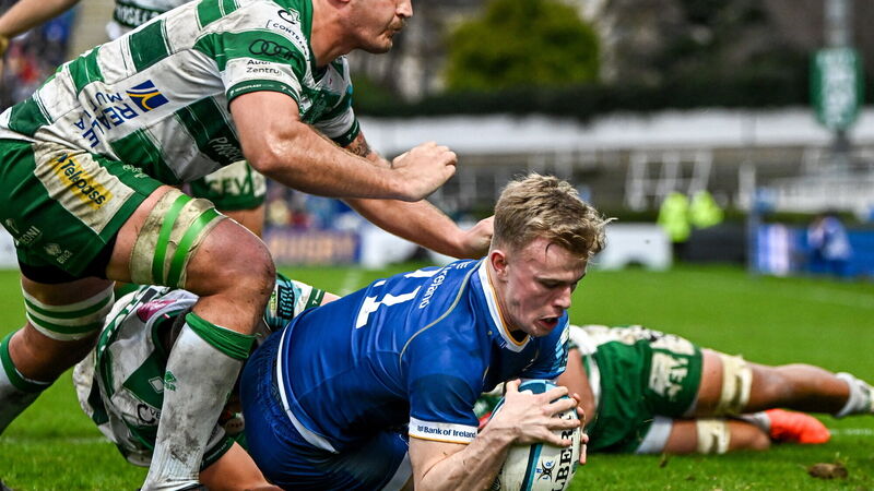 TOP OF TABLE CLASH: Ben Murphy of Leinster dives over to score his side's fifth try during the United Rugby Championship match between Leinster and Benetton at the RDS Arena in Dublin. Pic: Harry Murphy/Sportsfile