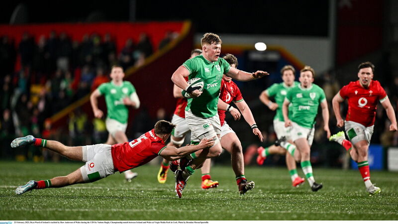 UNBEATEN: Bryn Ward of Ireland is tackled by Huw Anderson of Wales during the U20 Six Nations Rugby Championship match between Ireland and Wales at Virgin Media Park in Cork. Pic: Brendan Moran/Sportsfile