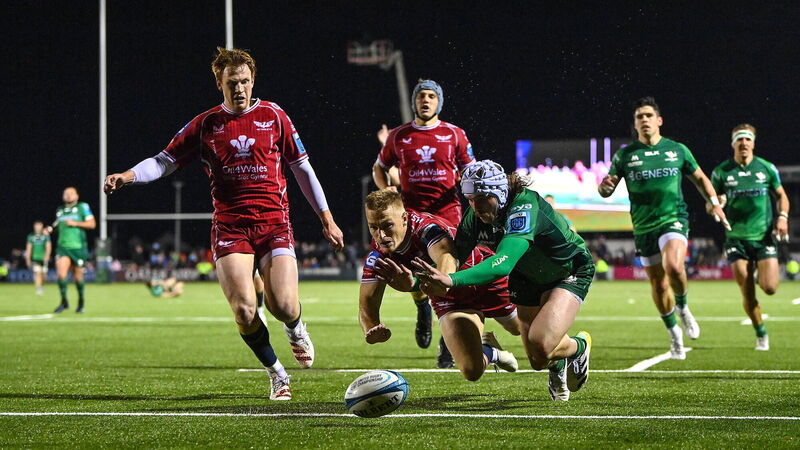RETURNING TO NEW ZEALAND: Mack Hansen of Connacht scores his side's fourth try despite the efforts of Johnny McNicholl of Scarlets during the United Rugby Championship match between Connacht and Scarlets at The Sportsground in Galway. Pic: Brendan Moran/Sportsfile