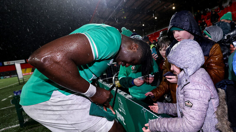 Ireland's Sean Edogbo signs autographs for fans after the win over Italy