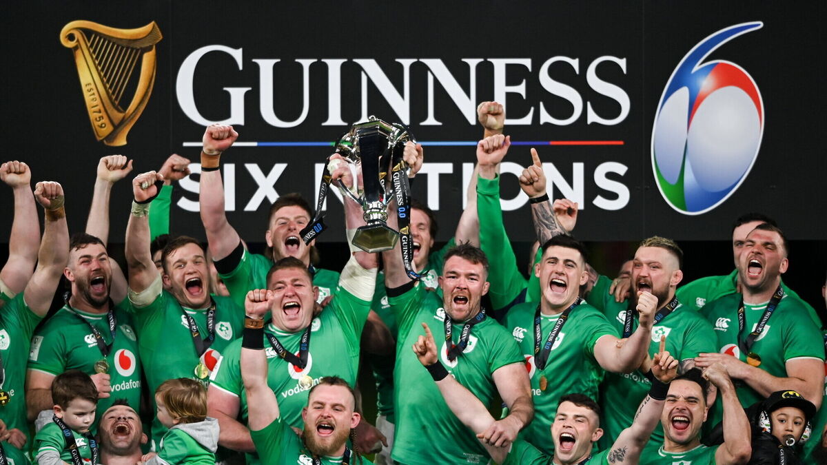 16 March 2024; Ireland captain Peter O'Mahony, right, and Tadhg Furlong lift the Six Nations trophy after the Guinness Six Nations Rugby Championship match between Ireland and Scotland at the Aviva Stadium in Dublin. Photo by Sam Barnes/Sportsfile
