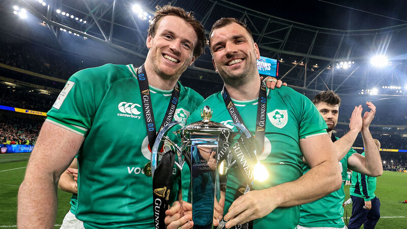 Ireland’s Ryan Baird and Tadhg Beirne celebrate with the trophy. Pic: INPHO/Dan Sheridan