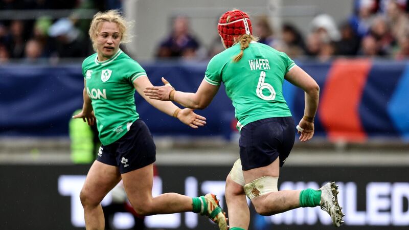 Ireland's Aoife Wafer celebrates after scoring a try with Neve Jones during the Six Nations game against France. Picture: ©INPHO/Ben Brady