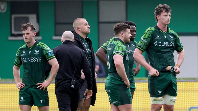 TOUGH TO TAKE: Dejected Connacht players, including Colm Reilly, left, following the United Rugby Championship match between Benetton and Connacht. Pic: Roberto Bregani, Sportsfile