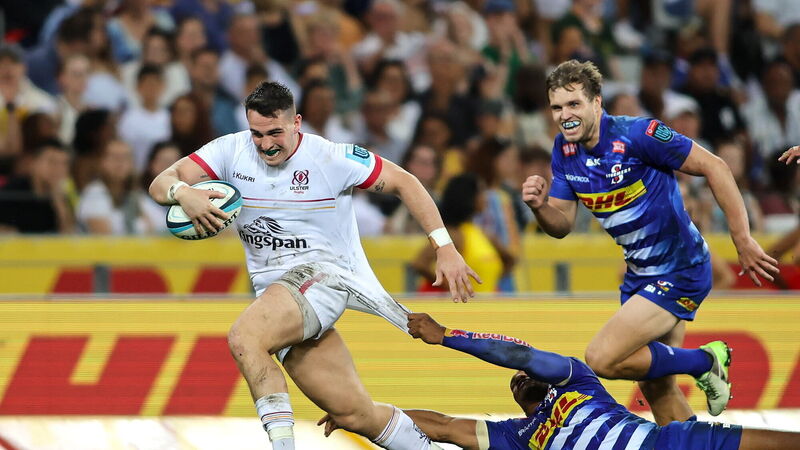 VITAL BONUS POINT: James Hume attempts to slip Damian Willemse tackle. Pic: Shaun Roy/Sportsfile