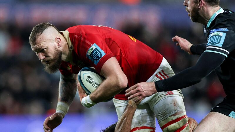 NECESSARY BULK: RG Snyman of Munster on his way to scoring his side's fourth try during the United Rugby Championship match between Ospreys and Munster. Pic: Chris Fairweather, Sportsfile