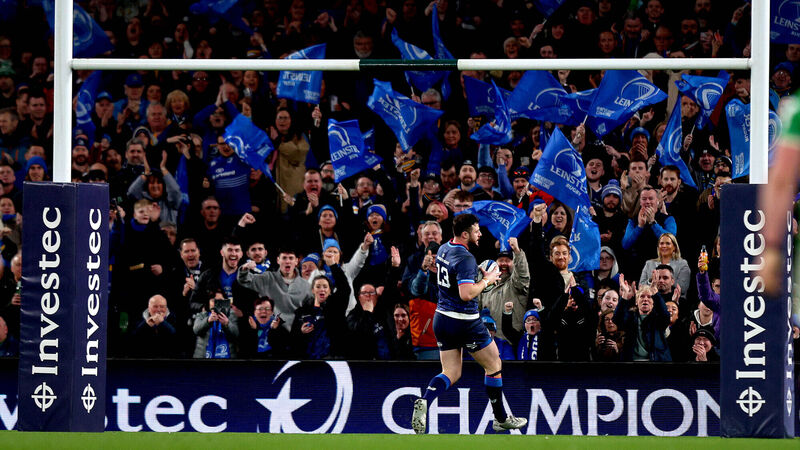 MAN OF THE PEOPLE: Leinster’s Robbie Henshaw scores a try. Pic: Ryan Byrne, Inpho