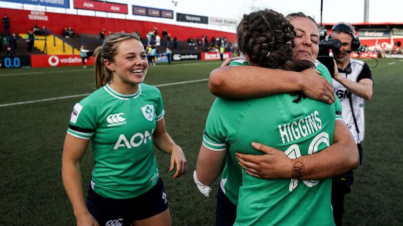 Ireland's Aoibheann Reilly, Eve Higgins and Brittany Hogan celebrate after their Six Nations victory over Wales. Picture: ©INPHO/Ben Brady