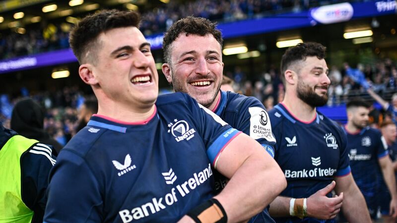 Will Connors and Dan Sheehan of Leinster after their side's victory over La Rochelle in the Champions Cup quarter-final. Photo by Harry Murphy/Sportsfile