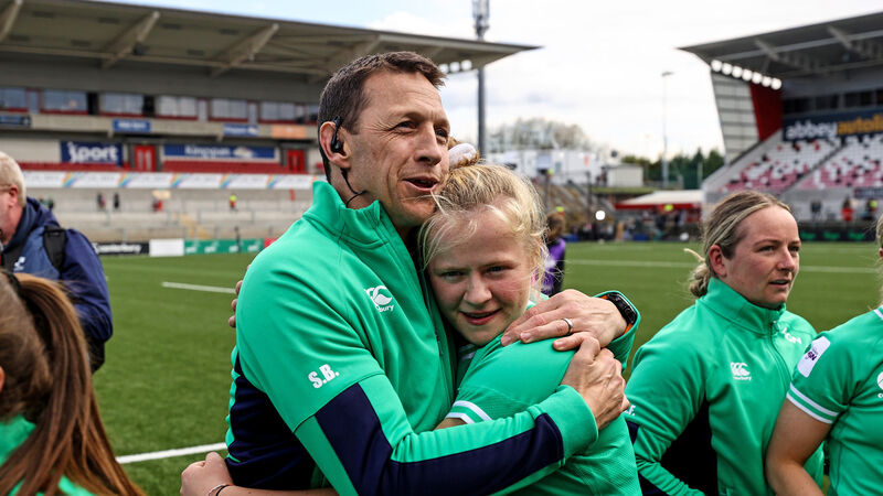 TEST SET: Ireland head coach Scott Bemand celebrates after the game with Dannah O'Brien. Pic: Ben Brady, Inpho