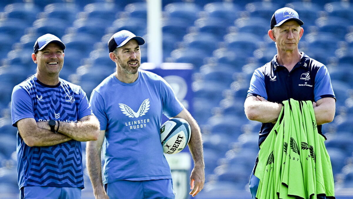 Leinster coaches, from left, senior coach Jacques Nienaber, backs coach Andrew Goodman and head coach Leo Cullen during a Leinster Rugby captain's run at the RDS Arena in Dublin. Pic: Harry Murphy, Sportsfile