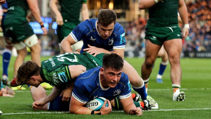 Leinster's Dan Sheehan scores his teams fourth try despite the efforts of Connacht's Colm Reilly. Picture: ©INPHO/Ben Brady