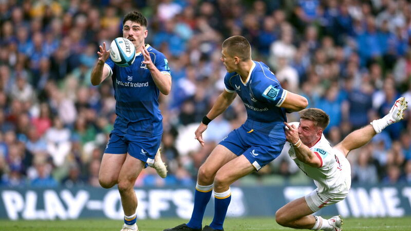ABLE DEPUTY: Jimmy O'Brien of Leinster receives a pass from Sam Prendergast during the United Rugby Championship quarter-final match between Leinster and Ulster. Pic: Ramsey Cardy, Sportsfile