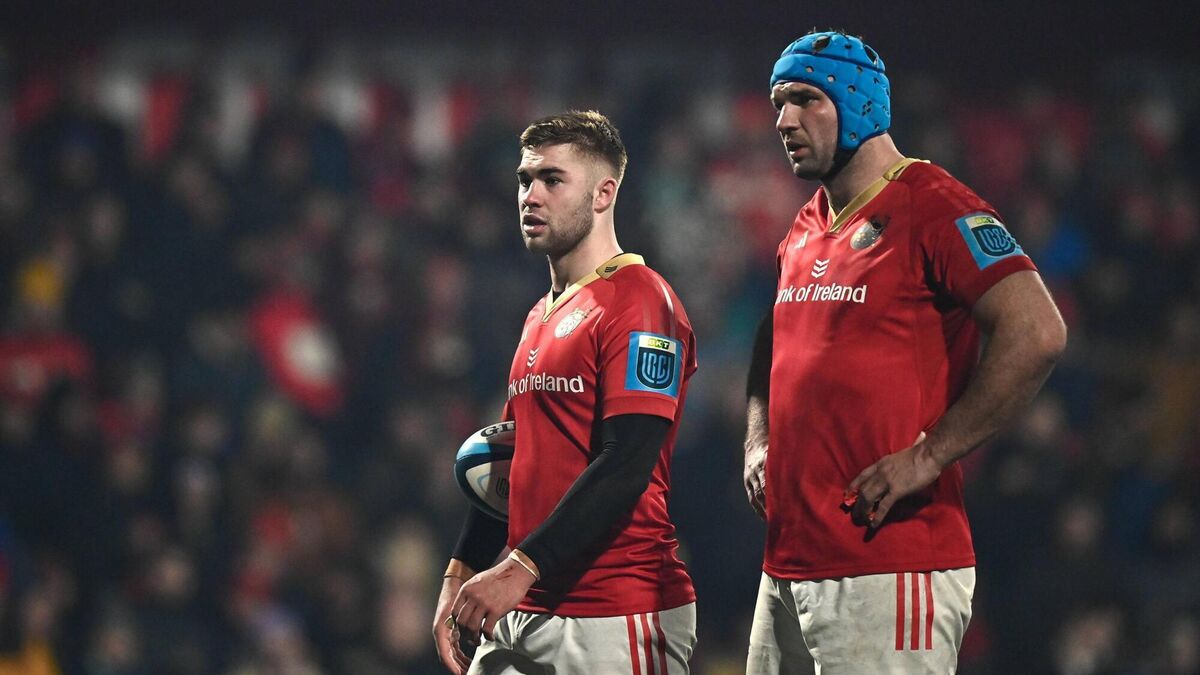 Jack Crowley, left, and Tadhg Beirne of Munster during the URC match against Glasgow Warriors at Musgrave Park in Cork. Photo by Eóin Noonan/Sportsfile