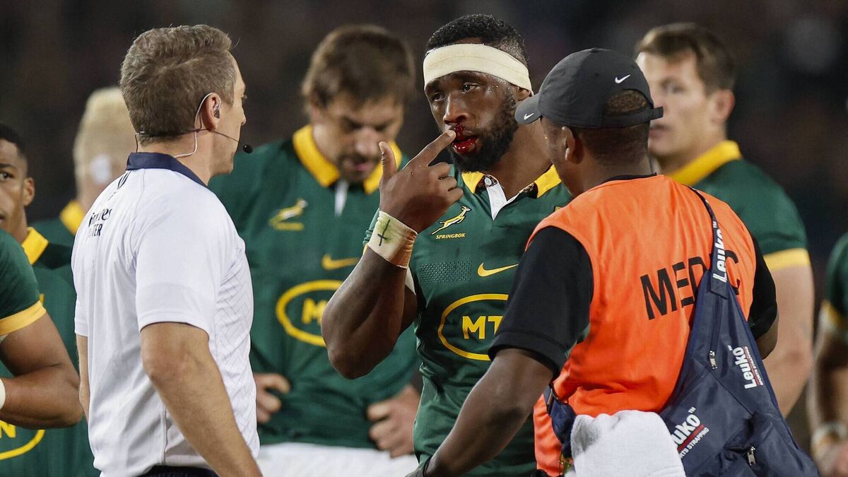 South Africa's flanker Siya Kolisi gestures with a bloody nose to the referee during the Rugby Championship Test against New Zealand last week. Pic: PHILL MAGAKOE/AFP via Getty Images)