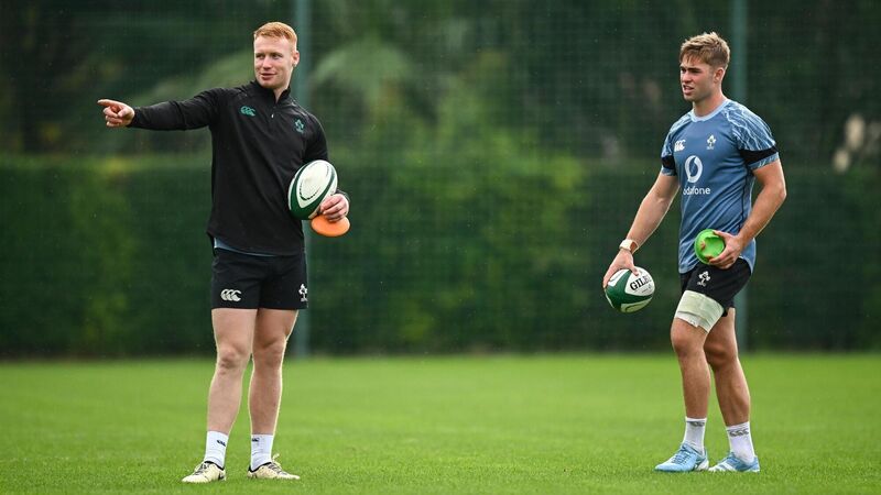 WHO GETS THE NOD? Ciarán Frawley, left, and Jack Crowley during an Ireland Rugby squad training session at The Campus in Quinta da Lago, Portugal. Pic: Seb Daly/Sportsfile