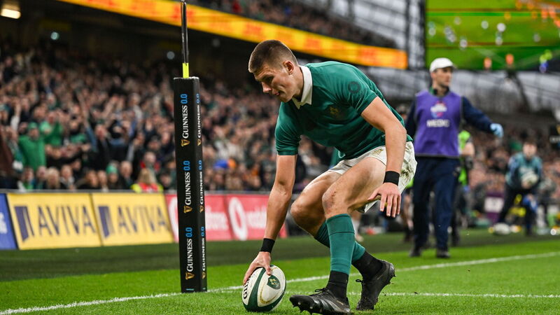 DOT DOWN: Sam Prendergast of Ireland touches down for a try, which was subsequently disallowe. Pic:Â David Fitzgerald/Sportsfile