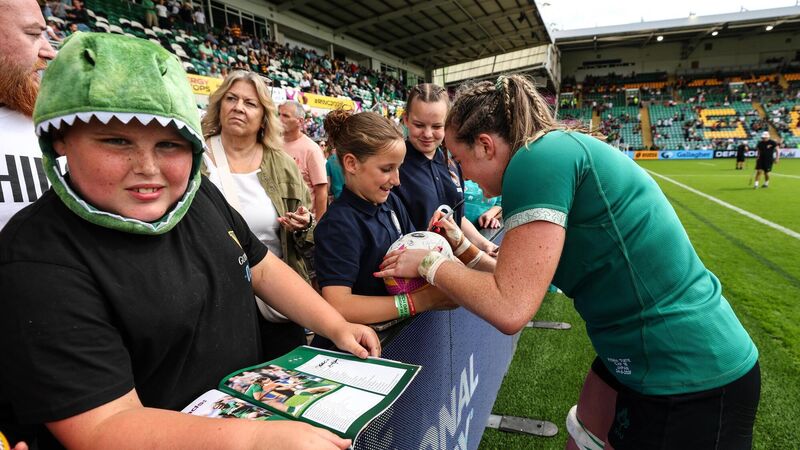 Ireland's Fiona Tuite signs autographs for fans after the game against Japan in the World Cup opener. Picture: Ben Brady/Inpho