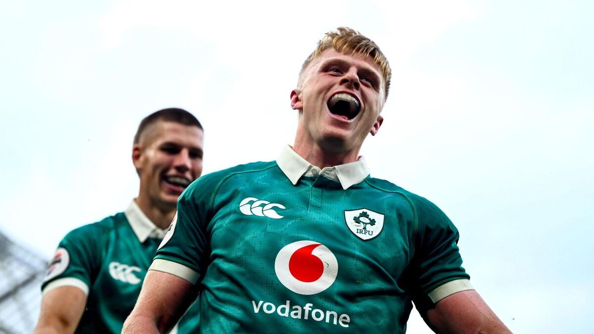 Tommy O'Brien celebrates the final try. Pic: Shauna Clinton/Sportsfile