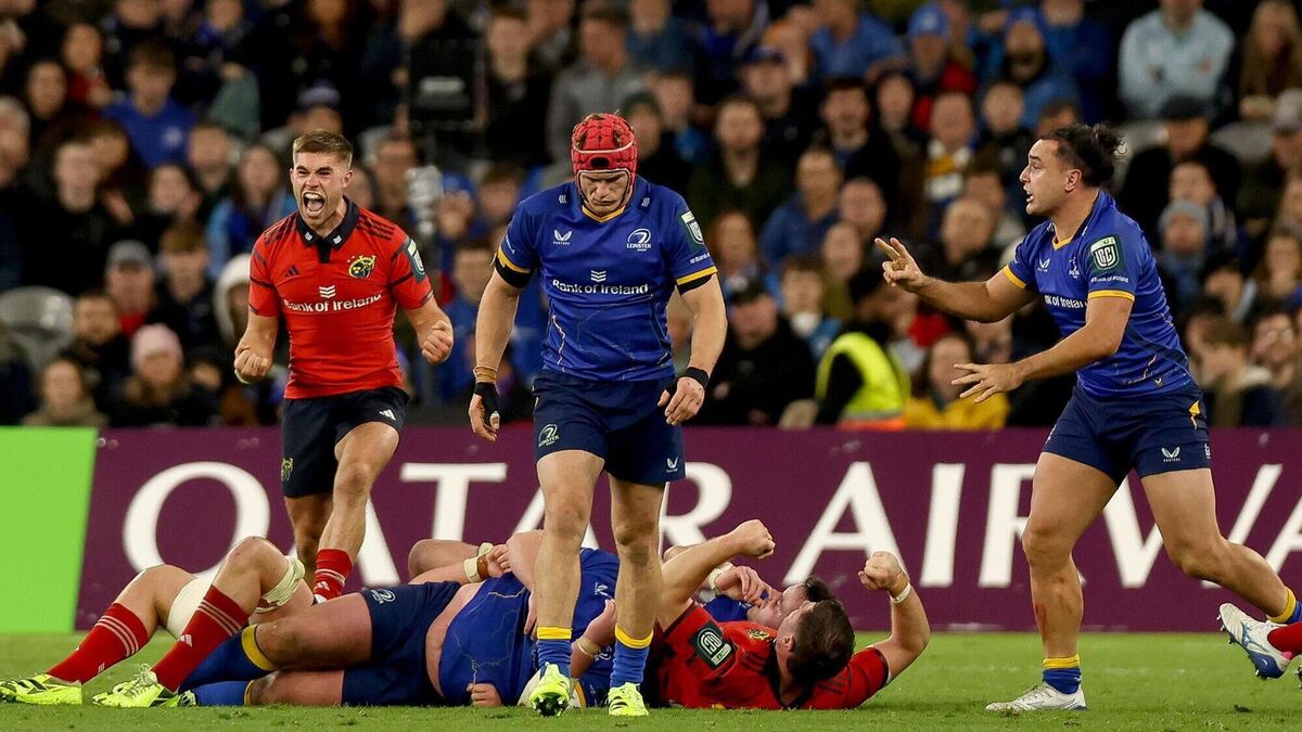 Munster's Jack Crowley celebrates whilst Josh van der Flier and James Lowe of Leinster look on at Croke Park. Pic: Tom Maher/Inpho