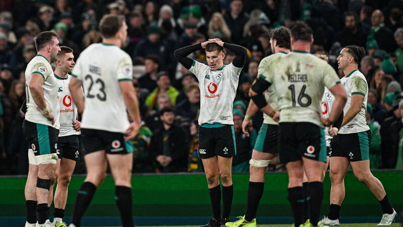 Sam Prendergast of Ireland reacts after the Quilter Nations Series game against South Africa at the Aviva Stadium. Pic: Ramsey Cardy/Sportsfile
