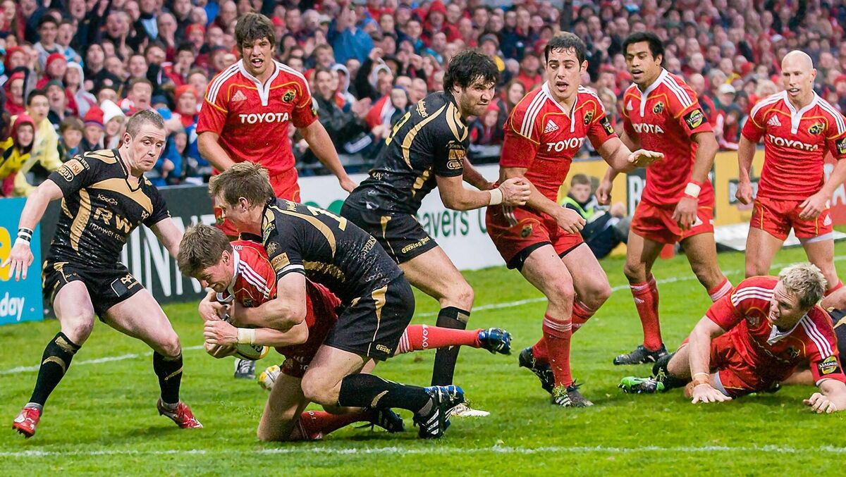 Not strictly within the limits of the book which is from the 2010-11 season but there are so many famous players in this shot, and it's ROG scoring one of the 10 tries he scored for Munster, I just had to include it.
