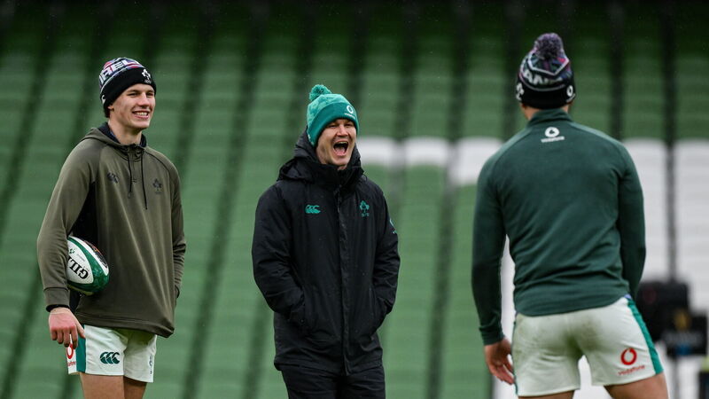 LAST LAUGH: Sam Prendergast, left, and assistant coach Jonathan Sexton during an Ireland Rugby captain's run at the Aviva Stadium in Dublin. Pic: Brendan Moran/Sportsfile