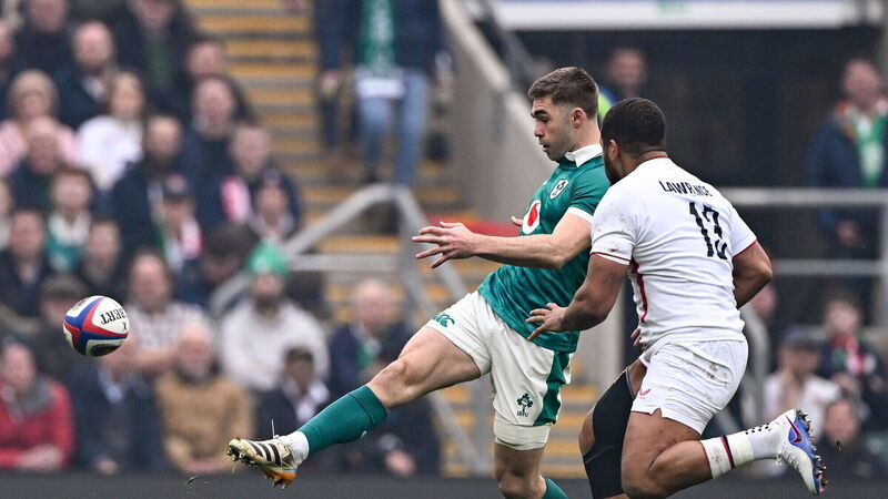 KICKING TEN: Jack Crowley of Ireland in action against England's Ollie Lawrence at Allianz Stadium in Twickenham. Pic: Ramsey Cardy/Sportsfile