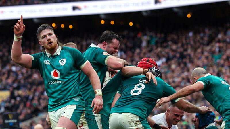 SOME SHOW JOE: Ireland's Joe McCarthy celebrates after Tadhg Beirne wins a penalty against England at Allianz Stadium