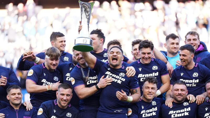 MORE TO COME?: Scotland's Sione Tuipulotu celebrates with The Auld Alliance Trophy and team-mates after the Guinness Men's Six Nations match at Scottish Gas Murrayfield Stadium, Edinburgh. Pic: Jane Barlow/PA Wire