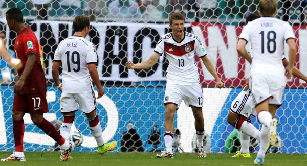 Thomas Muller’s hat-trick thrust Germany into centre stage in this thrilling World Cup as Joachim Low’s side demolished Portugal, their strongest Group G opponents, in Salvador.