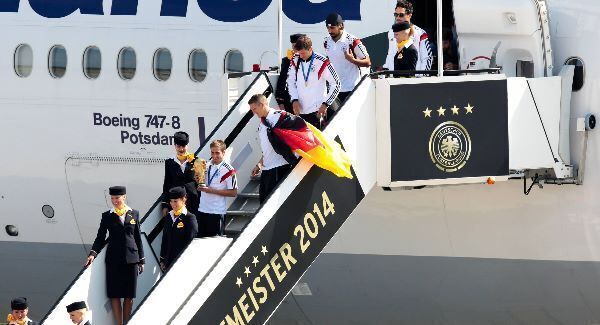 Captain Philipp Lahm led his champions from the aircraft shortly after 10am local time, followed by Bastian Schweinsteiger who was wearing the German flag, and the team were greeted by excited fans trying to get a glimpse of the trophy as they made their way through the airport.