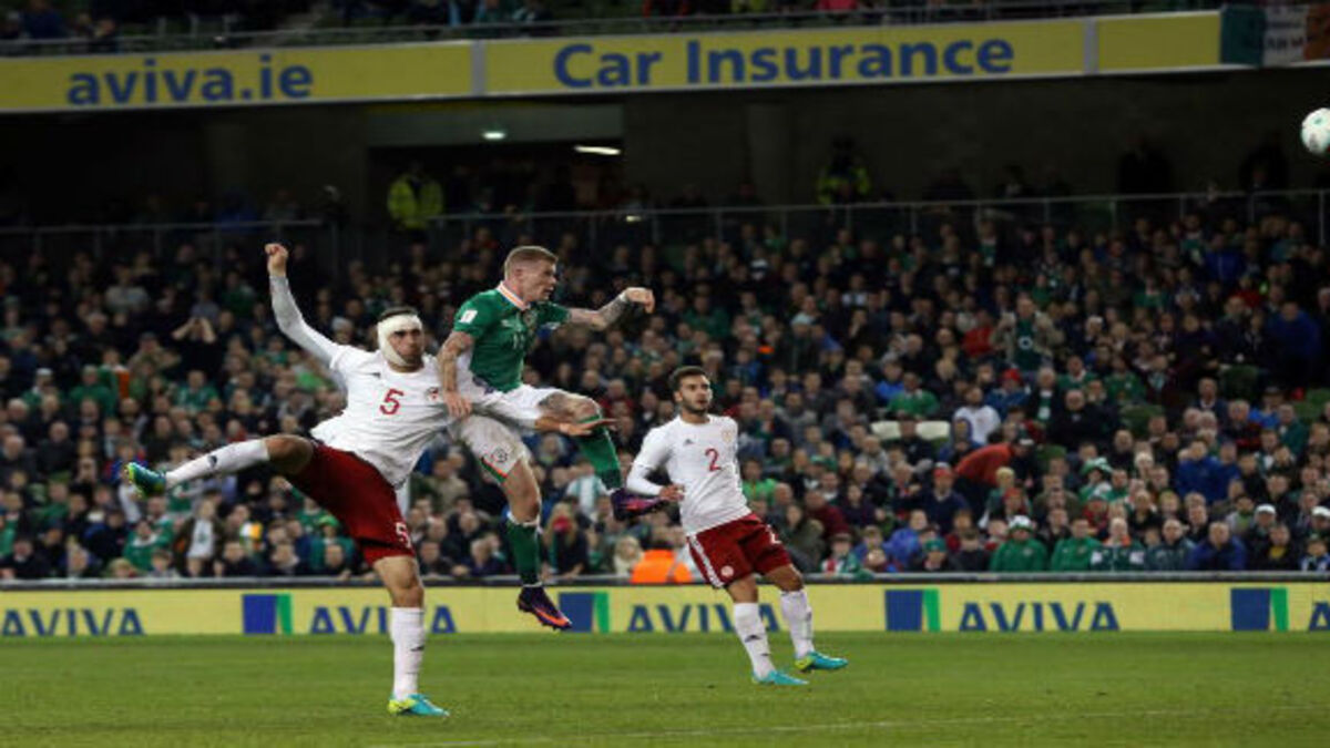 Hard luck, James McClean. Bullet of a header. Still 1-0 Ireland.