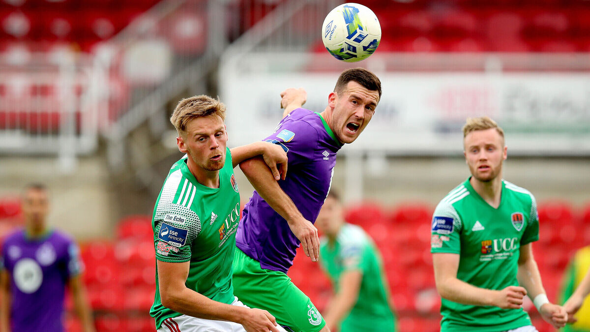 Cork’s City Rob Slevin and Aaron Greene of Shamrock Rovers contest a header. Picture: INPHO/Ryan Byrne