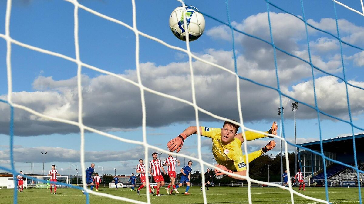 Sligo Rovers goalkeeper Ed McGinty watches as a shot from Waterford's Matthew Smith hits the back of the net during the SSE Airtricity League Premier Division match between Waterford and Sligo Rovers at the RSC in Waterford. Photo by Seb Daly/Sportsfile