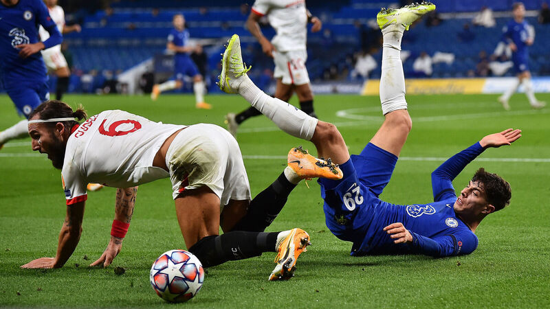 Sevilla's Nemanja Gudelj (left) and Chelsea’s Kai Havertz battle for the ball at Stamford Bridge. Photo: Glyn Kirk/PA