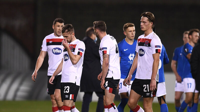 Dundalk players, including Daniel Cleary, right, react following the UEFA Europa League loss to Molde FK at Tallaght Stadium. Picture: Ben McShane/Sportsfile