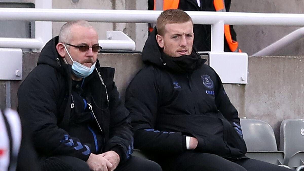 Everton goalkeeper Jordan Pickford (right) was on the bench at St James’ Park (Alex Pantling/PA)