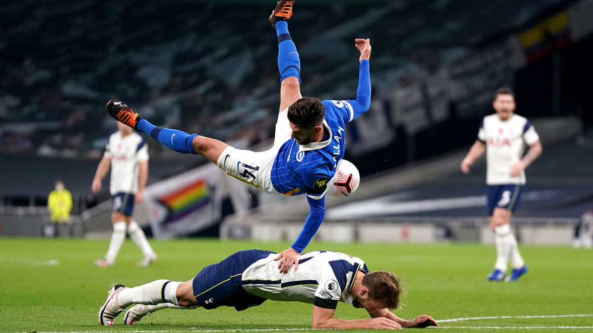 Brighton’s Adam Lallana (top) brings down Tottenham’s Harry Kane inside the box, resulting in a penalty.