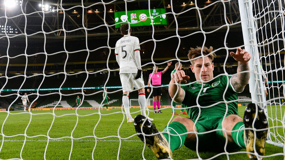 Ireland's James Collins reacts after a missed opportunity on goal during last night's Uefa Nations League B match against Bulgaria at Aviva Stadium. Picture: Stephen McCarthy/Sportsfile