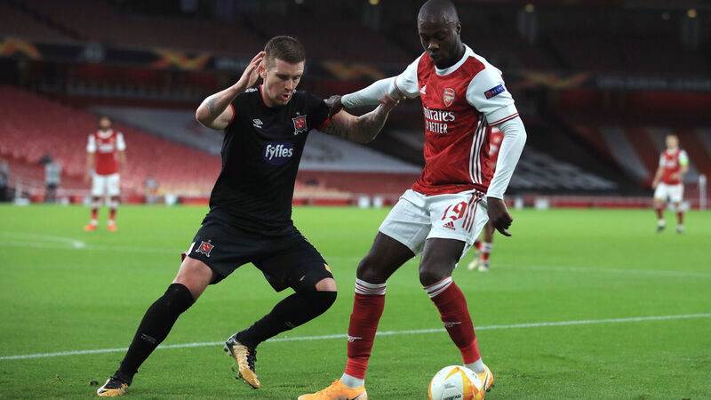 Arsenal's Nicolas Pepe (right) holds off Dundalk's Patrick McEleney at the Emirates Stadium. Picture: Adam Davy/PA